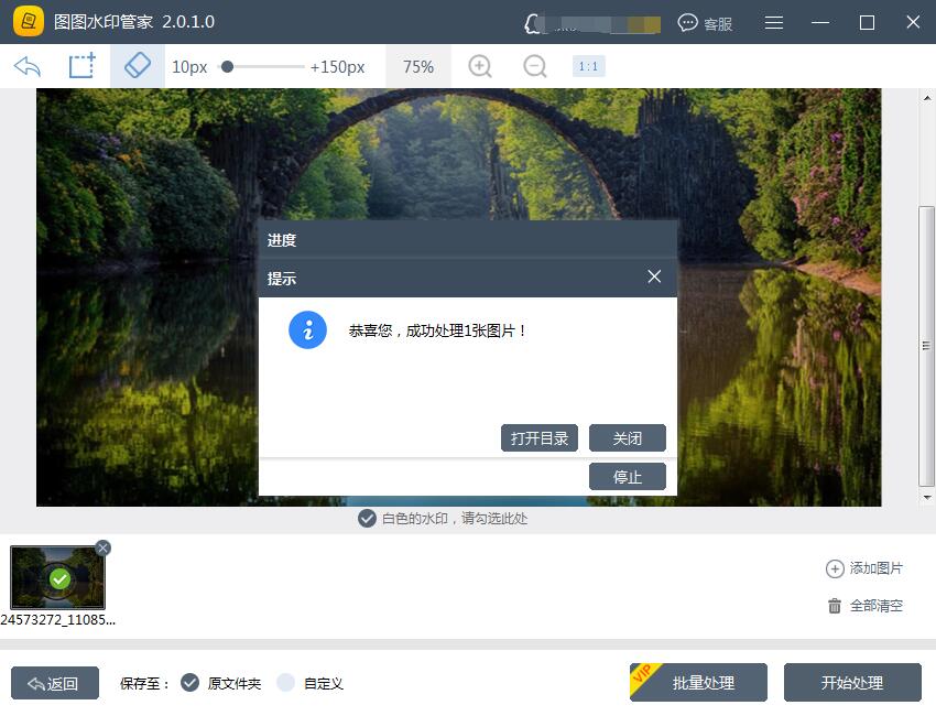 步骤四:等待一段时间,软件就会弹出一个提示查看,提示去水印成功。这时点击弹窗上的【打开目录】按钮可以打开处理好的图片的保存文件夹,我们可以在该文件夹里面找到处理好的照片进行查看和编辑。点击【关闭】按钮,可以关闭弹窗,然后在软件上直接查看去水印后的图片。如果大家发现自己水印涂抹得不是很完整,可以再次涂抹残遗水印进行去水印。